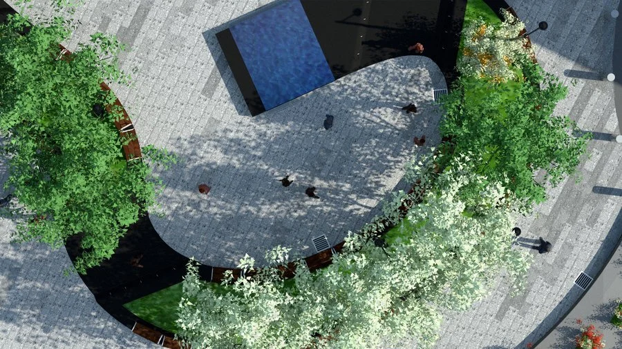 Our design features an undulating, bench-lined, planted strip that accommodates commuter waiting and creates a flexible-use plaza centered on a fountain. The strip’s geometry makes diverse seating arrangements, including an area for café tables and gatherings. When idle, the fountain serves as a stage for performances. Paths through the strip give convenient shortcuts for commuters. The design of the Plaza creates a place of repose without interrupting the vibrant activity of the area.
